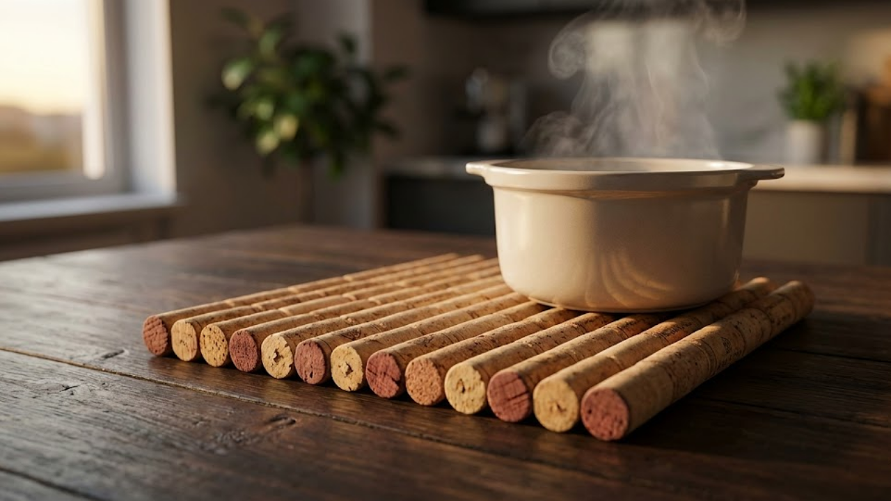 Descanso de panela de rolhas em mesa rústica com luz quente