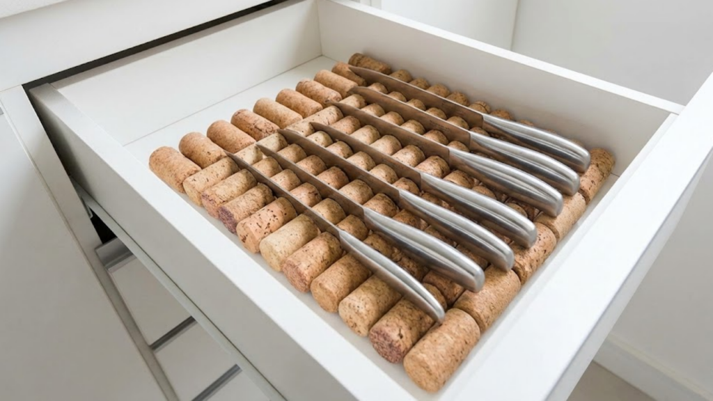Gaveta organizada com suporte de facas feito de rolhas