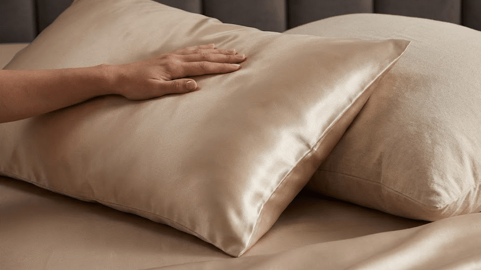 Close-up tátil de uma mão alisando uma fronha de cetim brilhante ao lado de uma de algodão