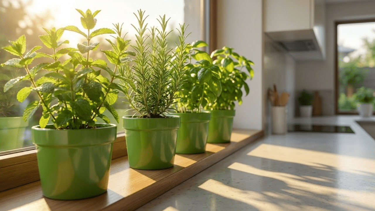 Horta de ervas aromáticas em janela ensolarada protegendo a cozinha