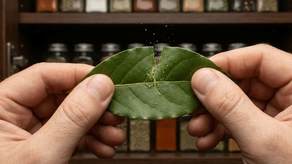 Mãos esmagando folha de louro para liberar óleos repelentes naturais