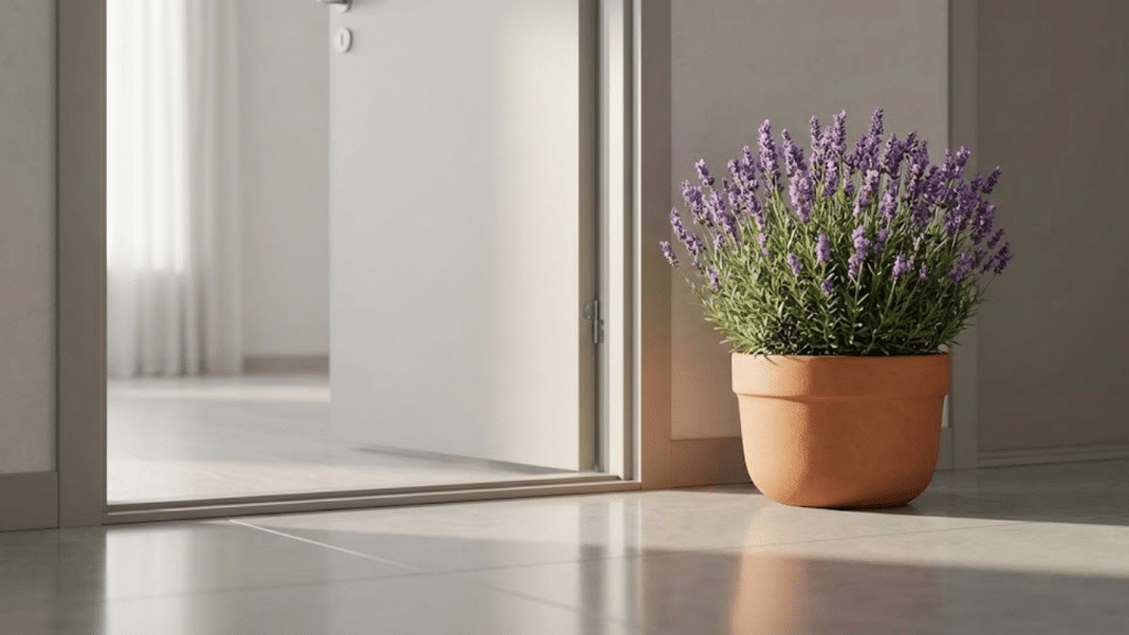 Vaso de lavanda posicionado estrategicamente na entrada de um apartamento