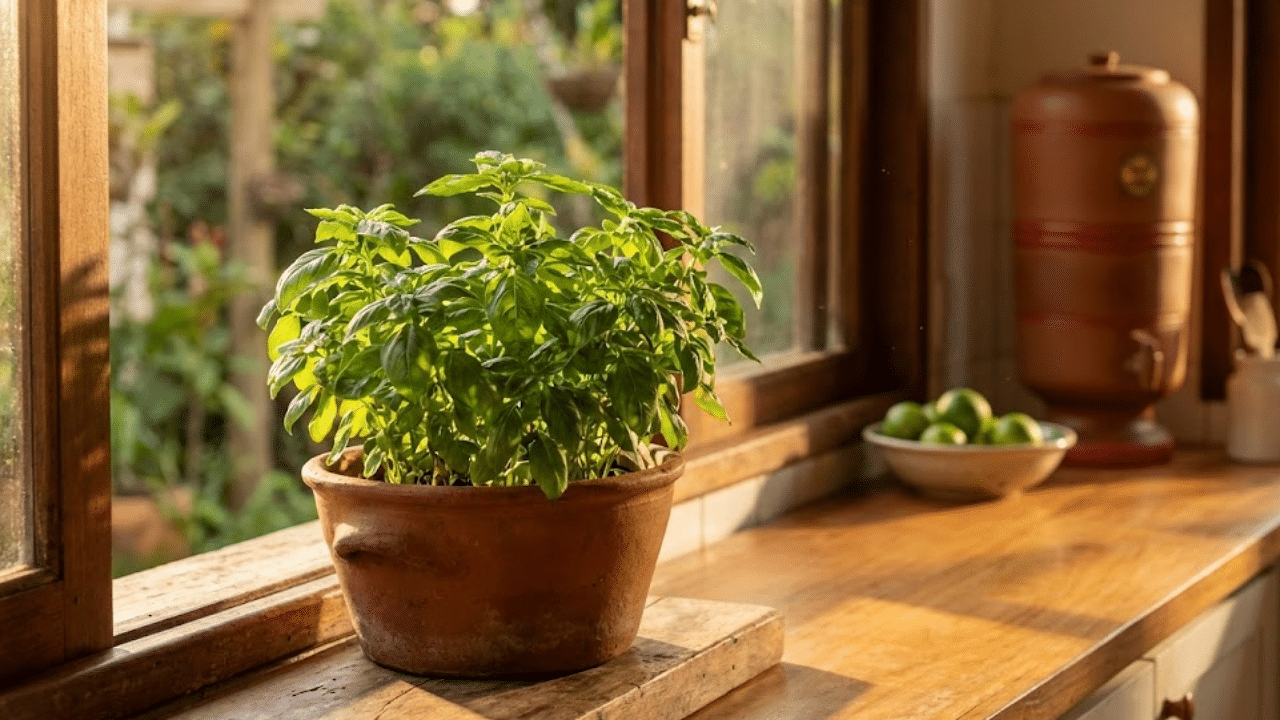 Vaso de manjericão viçoso na janela de cozinha iluminada pelo sol.
