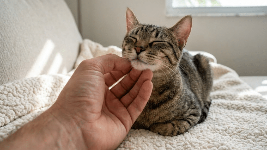 Close de mão fazendo carinho no queixo de um gato listrado