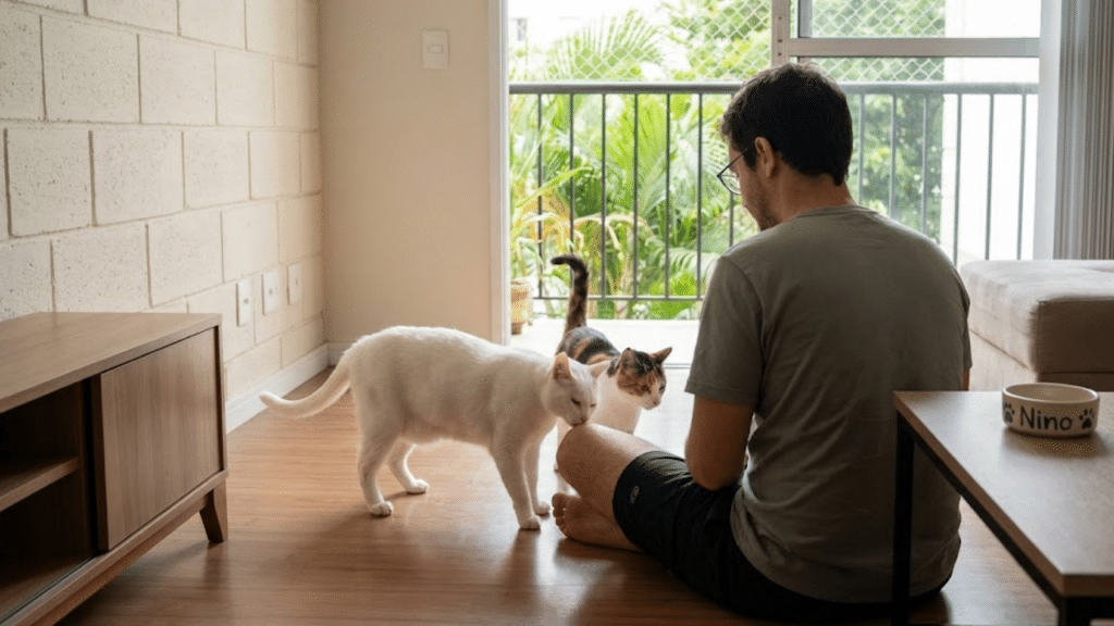 Pessoa interagindo com gatos em sala clara e arejada