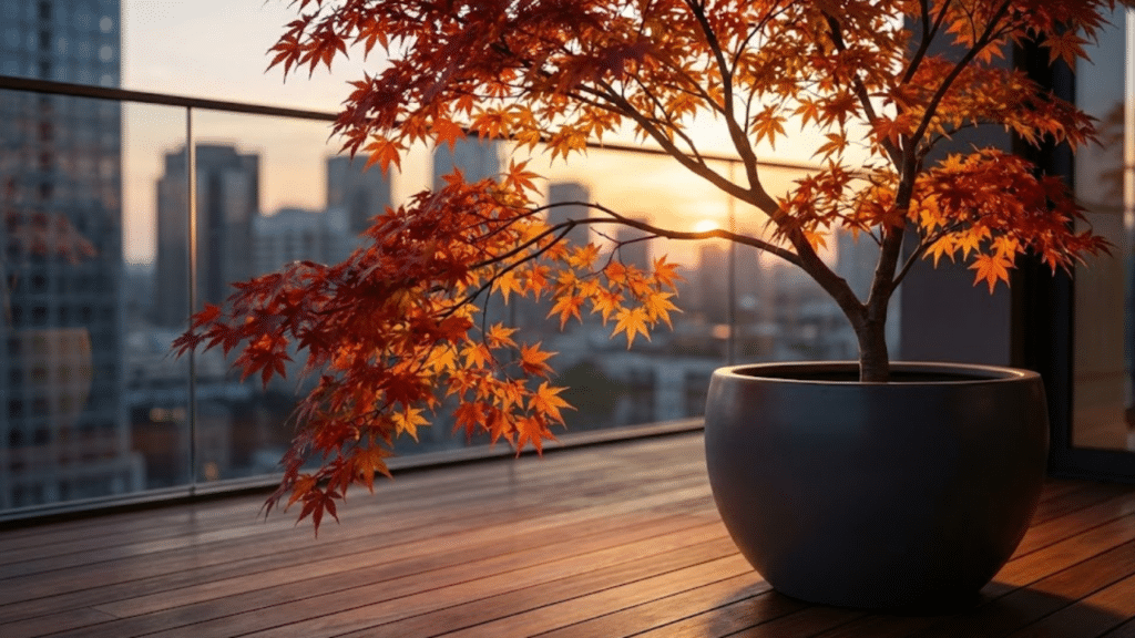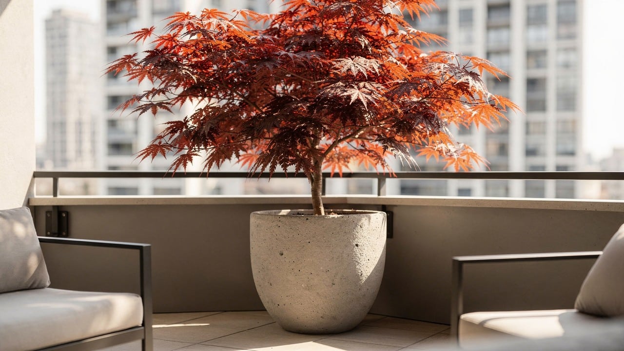 Cultivar um Acer palmatum vale o investimento para quem busca sofisticação e conexão com a natureza em pequenos espaços. Além de não ocupar muito espaço horizontal, a copa filtrada da árvore cria uma sombra suave que não bloqueia totalmente a luz do apartamento, mantendo o ambiente interno agradável e bem iluminado.