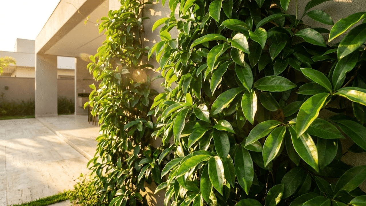 Folhagem densa de ora-pro-nóbis em muro moderno sob sol dourado