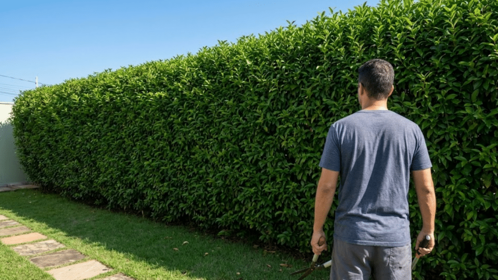 Cerca viva de ora-pro-nóbis em quintal brasileiro sob céu azul
