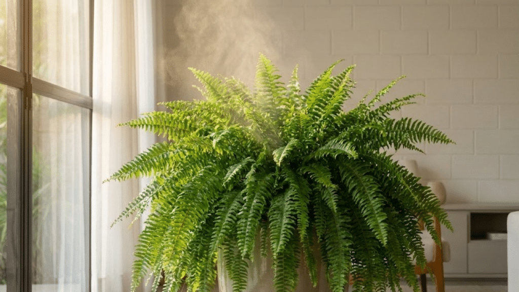 A samambaia-de-boston eleva a umidade do ar através da transpiração foliar, combatendo o desconforto térmico em ambientes fechados. Esta espécie funciona como um umidificador natural, suavizando a sensação de calor seco e tornando o clima doméstico mais leve.