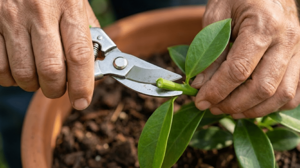 Mãos realizando poda de manutenção em ora-pro-nóbis em vaso