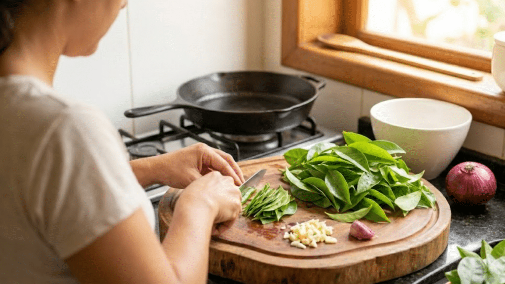 Folhas frescas de ora-pro-nóbis sendo preparadas em cozinha iluminada