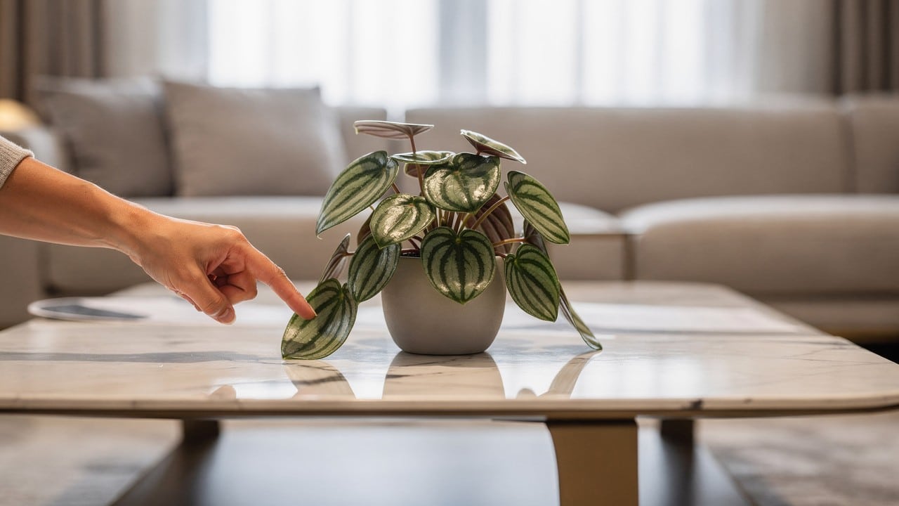 Peperômia-melancia em destaque sob luz solar suave em sala moderna