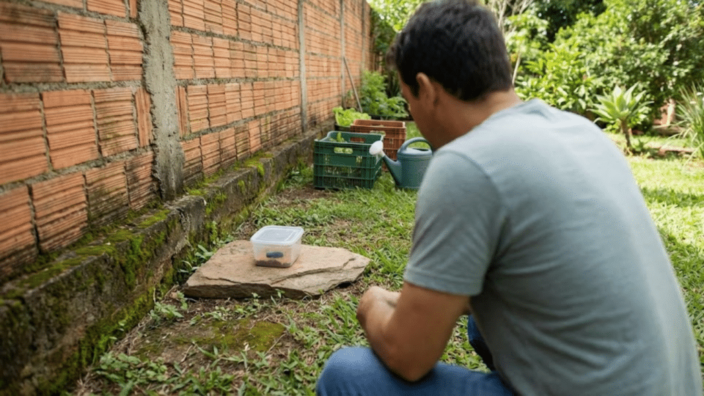 - Escolher o local: posicionar o pote em área onde as formigas costumam circular, mas longe das mudas jovens e dos vasos mais delicados.