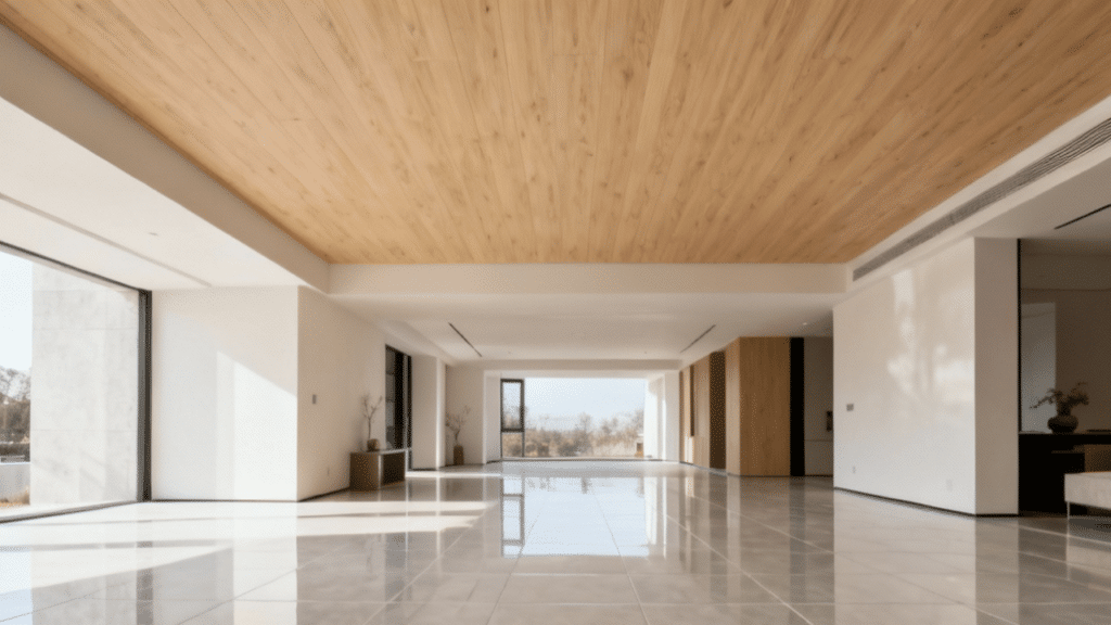 Esqueça o visual de “forro de posto de gasolina”. A indústria investiu pesado para que o vinílico se tornasse um item de decoração. Hoje, as placas possuem larguras maiores e encaixes “macho e fêmea” tão justos que as emendas somem, criando a sensação de um teto monolítico e sofisticado.