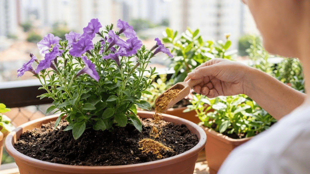 A frequência recomendada é a cada 15 dias durante a primavera e o verão, épocas de maior crescimento, e mensalmente no outono e inverno. Se optar pela farinha, basta misturar uma colher de sopa na terra ao redor do caule a cada mês, garantindo que o pó se incorpore ao substrato durante as regas normais.