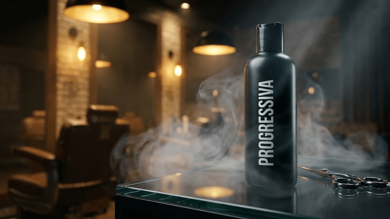 Frasco de progressiva em salão sofisticado sob luz dramática e névoa