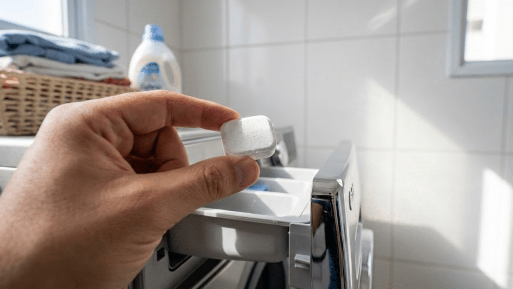 Mão segurando pastilha efervescente sobre gaveta de máquina de lavar