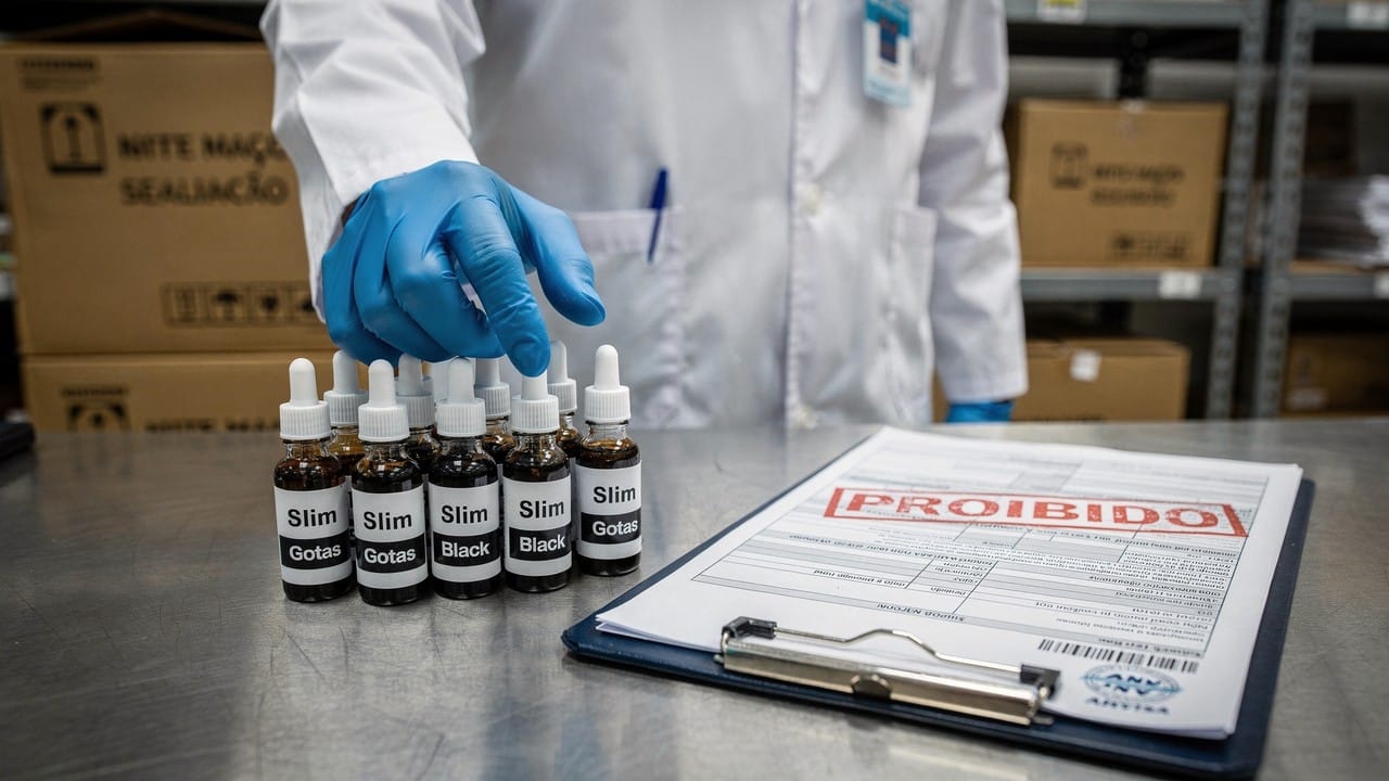 Anvisa proíbe Slim Gotas e Slim Gotas Black após identificar que os produtos eram vendidos com promessas falsas de cura para doenças graves. A medida, publicada na Resolução-RE nº 4.519, determina a apreensão imediata de todas as unidades encontradas no mercado brasileiro devido ao alto risco à saúde dos consumidores.