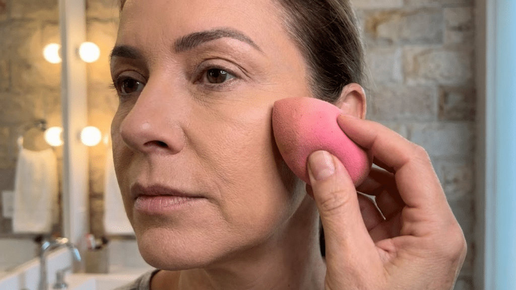 Esponja úmida aplicando base em pele madura para efeito de preenchimento