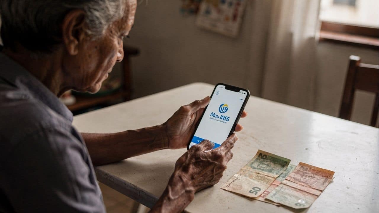 Aplicativo Meu INSS com notas de dinheiro embaixo do celular – Créditos: depositphotos.com / rafapress
