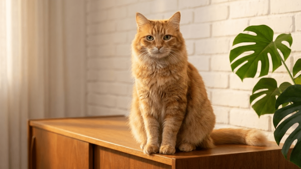 Gato laranja imponente em sala iluminada pelo sol da tarde