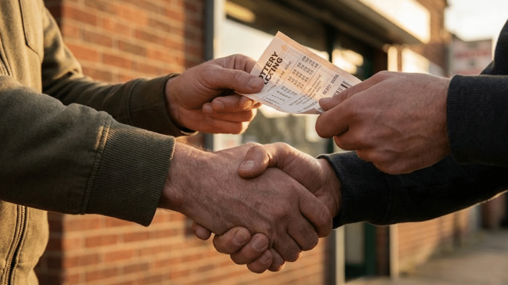 Close-up de um aperto de mão firme entre dois homens, com o bilhete sendo devolvido sob a luz do sol