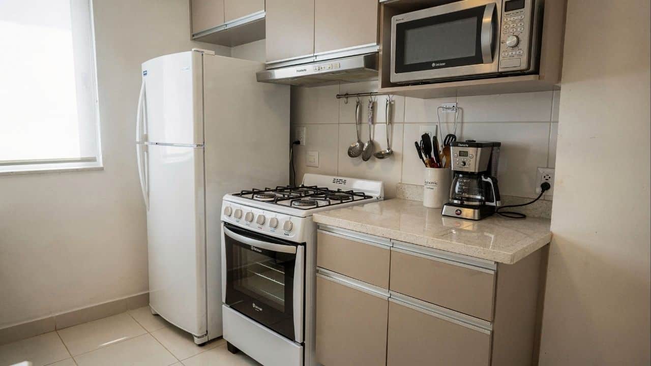 Regra de Ouro: Aparelhos de uso diário (geladeira, fogão, micro-ondas) devem estar na “zona de alcance rápido”. Itens eventuais podem ocupar prateleiras altas para liberar espaço de bancada.