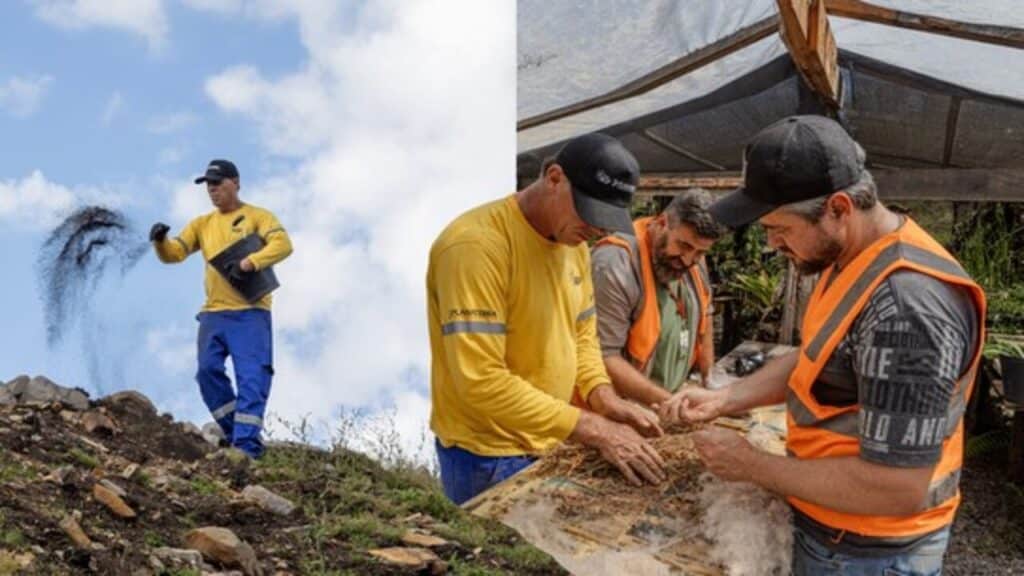 A aplicação ocorre manualmente a lanço, por equipamentos acoplados a veículos ou combinada com solos orgânicos do entorno, sobretudo em taludes, áreas de empréstimo e pontos de movimentação de terras. Entre as vantagens estão a eficiência ecológica, a viabilidade em terrenos irregulares e o potencial de redução de custos e de uso de espécies exóticas. Veja imagens de como funciona a técnica na prática (Reprodução/Instagram/@rioterra.org.br):