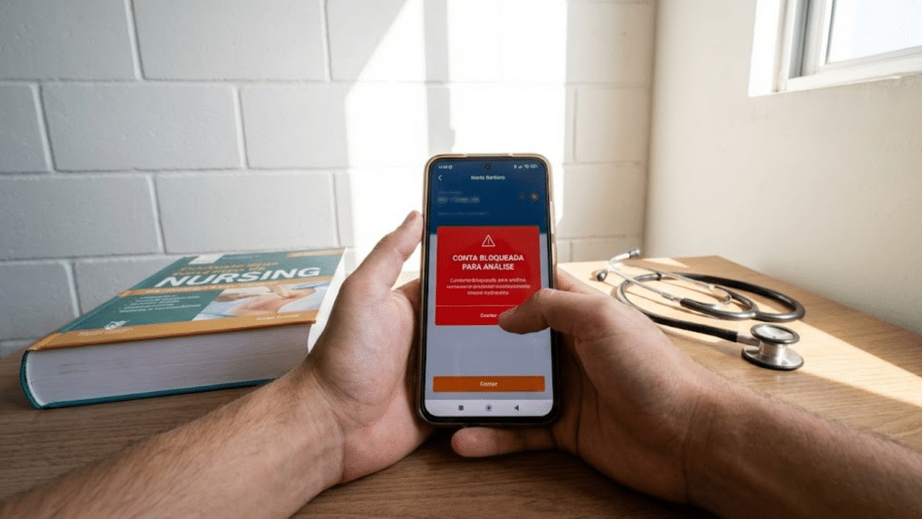 Celular com aviso de conta bloqueada em ambiente de estudos