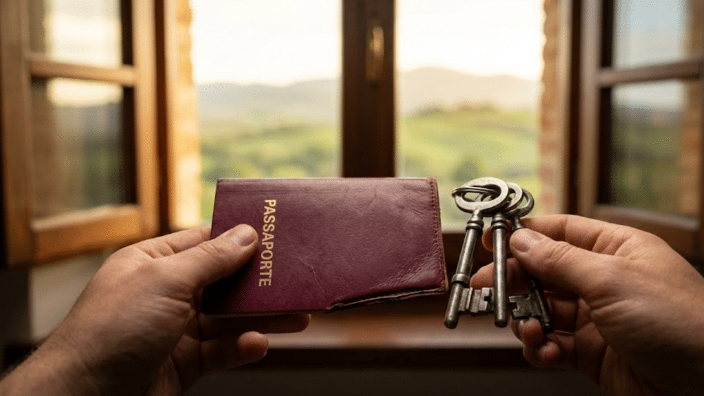 Pessoa segurando um passaporte europeu e chaves rústicas antigas com uma janela para as colinas toscanas ao fundo