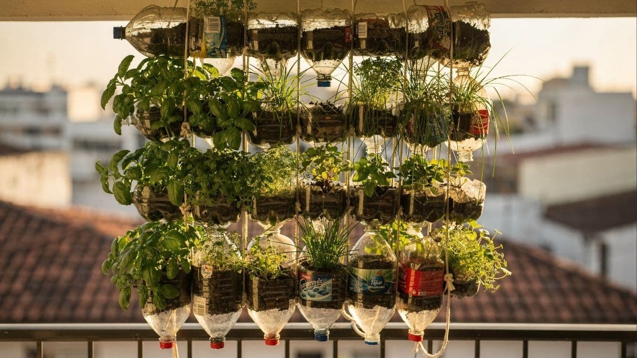 Horta em garrafa PET que precisa de só 3 horas de sol e transforma sacadas de 1 m² em mini jardins comestíveis