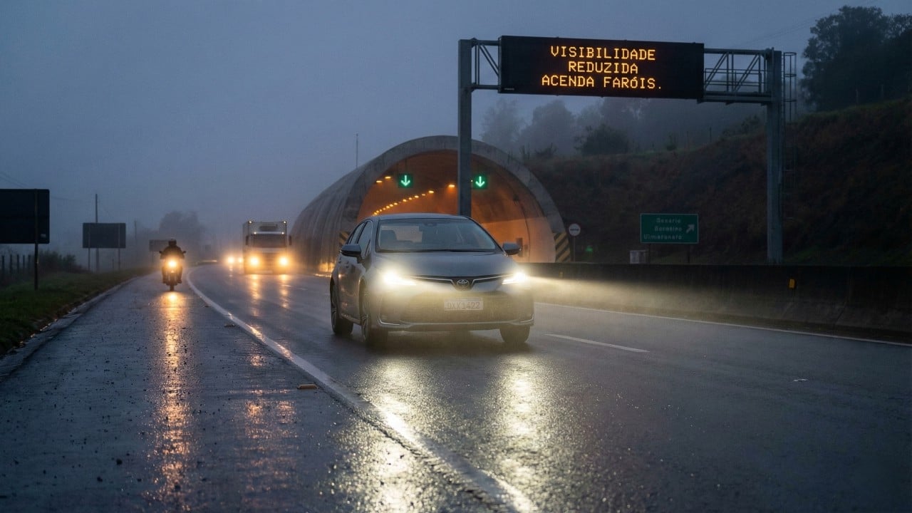 À noite, o farol baixo deve permanecer ligado em qualquer tipo de rodovia, e em túneis a iluminação é obrigatória mesmo durante o dia, com a conduta irregular também classificada como infração média, sujeita a pontos na CNH e aplicação de multa conforme o Código de Trânsito Brasileiro.