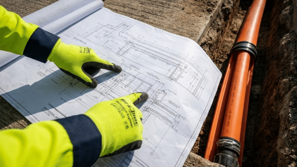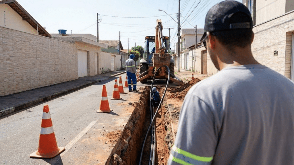 Equipe técnica trabalhando na escavação e instalação de dutos subterrâneos