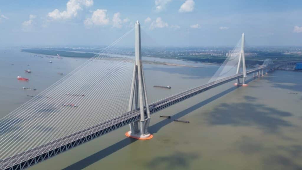 A mega ponte estaiada foi planejada e construída pela estatal China Communications Construction, exigindo a elevação de mais de 10 mil toneladas ao longo dos cabos principais. O projeto combina aço e concreto de alta resistência, além de tecnologias avançadas de monitoramento estrutural em tempo real.