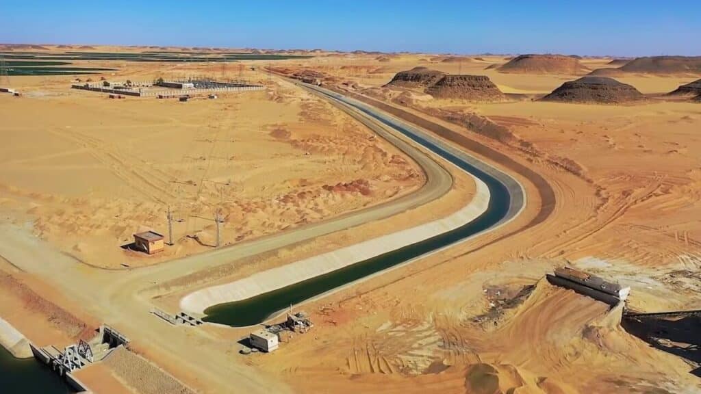 Uma vez bombeada, a água segue pelo sistema de canais conhecido como Canal Sheikh Zayed, principal corredor de distribuição no deserto. Estimativas mencionam extensão total próxima de 310 quilômetros, somando o tronco principal e os trechos de derivação para diferentes blocos de irrigação.