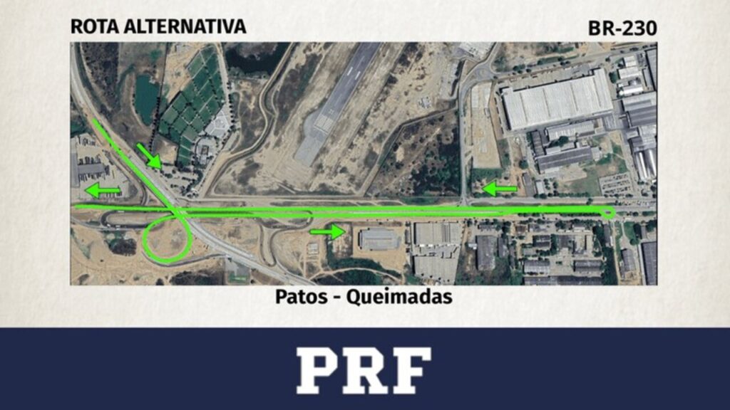 Para minimizar os impactos da interdição na BR-230 em Campina Grande, a PRF divulgou rotas alternativas para quem precisa chegar a Queimadas e demais cidades do Agreste. Os desvios utilizam o viaduto e a BR-104/PB, passando por área urbana próxima à Avenida Assis Chateaubriand, com aumento discreto de percurso e tempo de viagem.