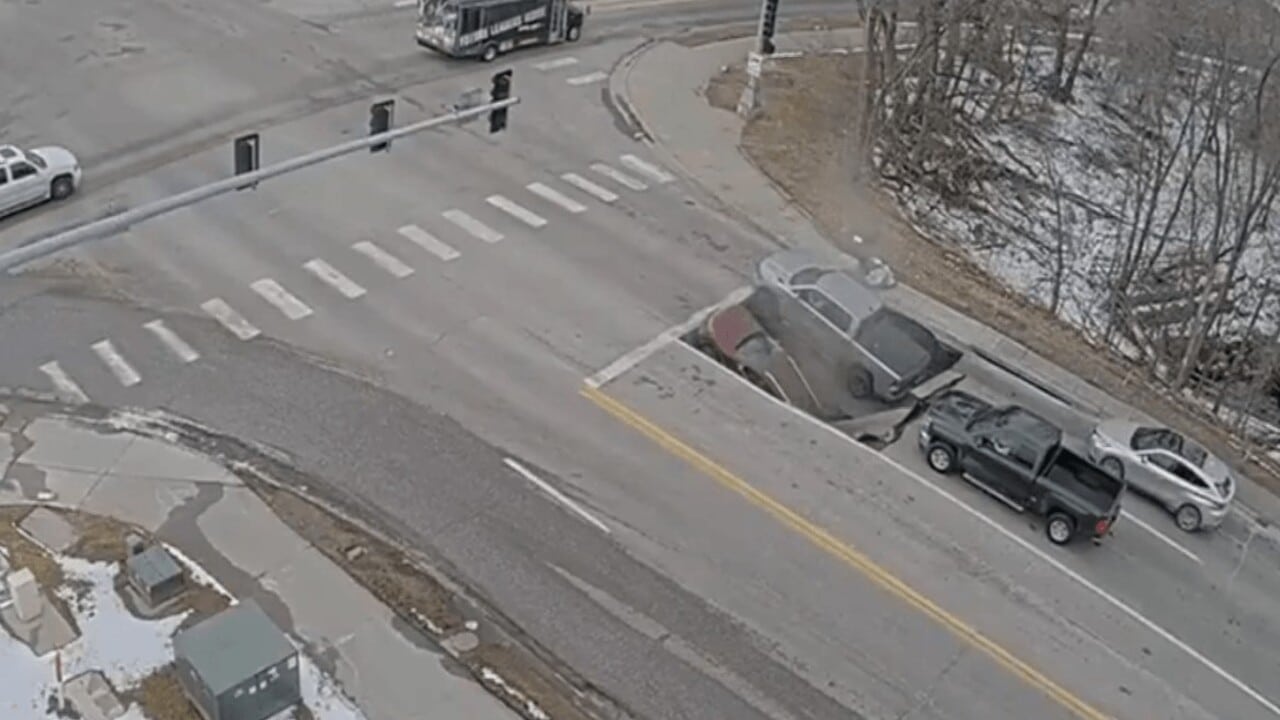 As imagens de uma câmera de trânsito mostram veículos parados no semáforo quando, de forma abrupta, o asfalto cede e o cruzamento se transforma em um grande buraco, fazendo com que os carros deslizem para dentro da abertura com a parte dianteira apontada para cima.