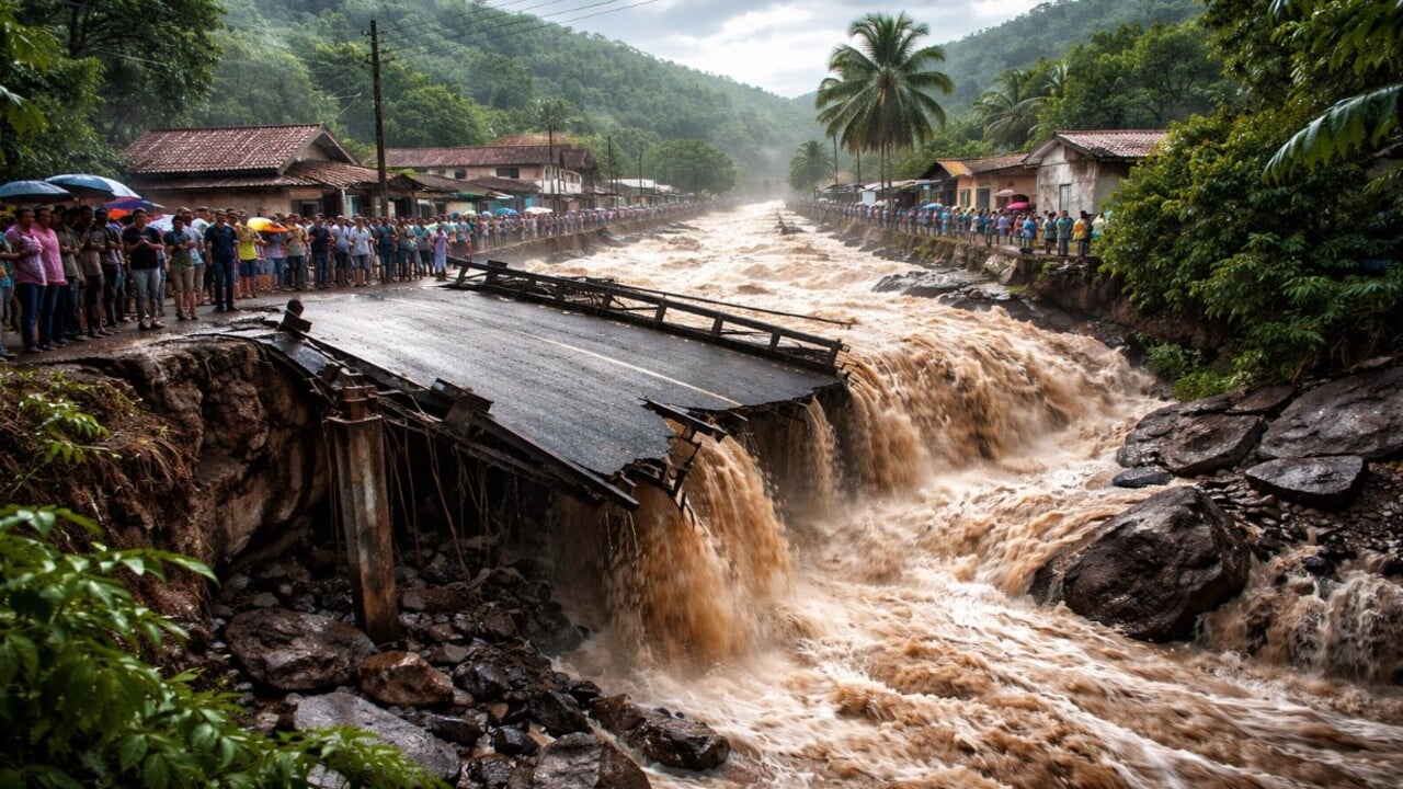 Vídeos que circulam nas redes sociais mostram a ponte destruída e a força da correnteza. Dois homens foram arrastados pela água, resgatados sem ferimentos graves, enquanto a passagem de veículos e pedestres segue bloqueada. Veja um vídeo divulgado nas redes sociais (Reprodução/Instagram/@manchetealagoas):
