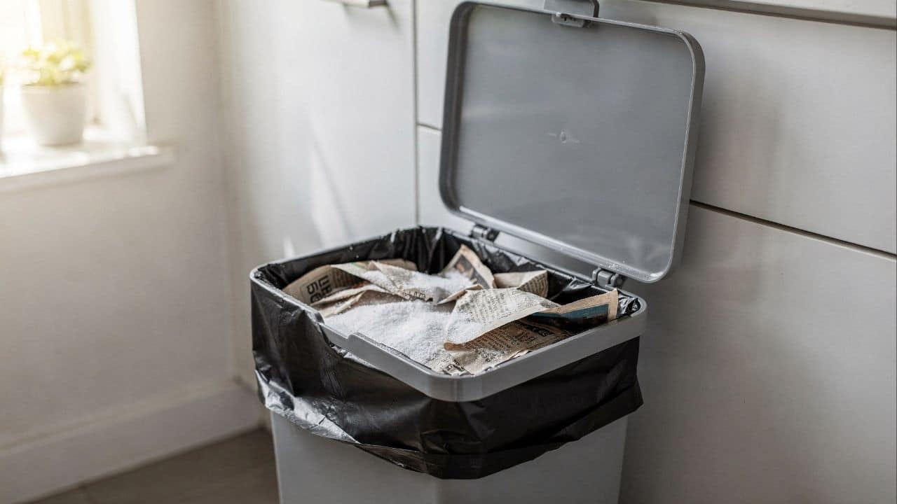 Além do jornal, alguns cuidados complementares tornam o manejo do lixo mais higiênico no dia a dia. O bicarbonato de sódio no fundo do cesto, por baixo ou sobre o jornal, ajuda a absorver umidade e neutralizar odores de resíduos orgânicos em decomposição.