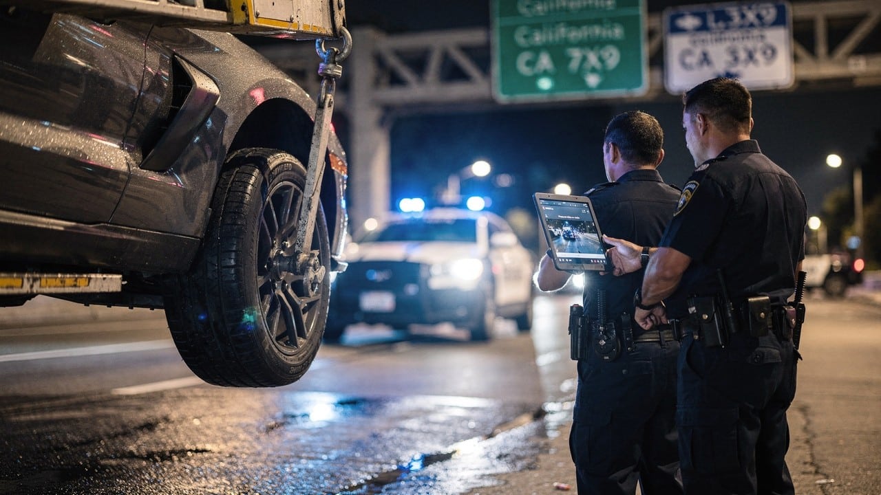 Carro esportivo sendo guinchado sob luzes policiais na Califórnia