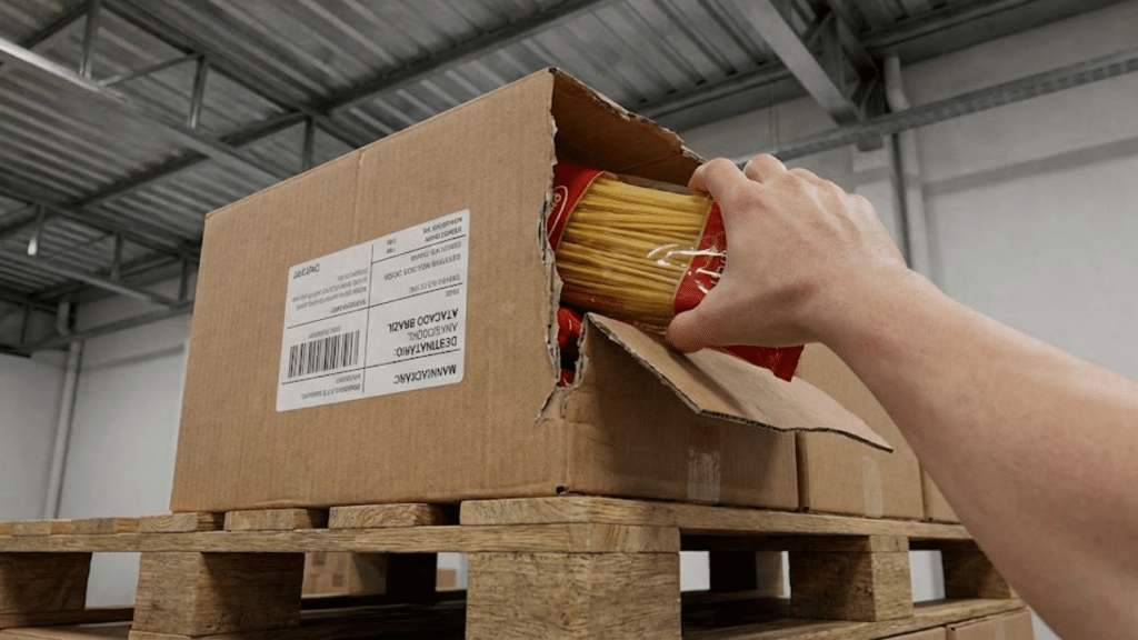Cliente pegando pacote de macarrão direto da caixa de papelão aberta sobre um pallet