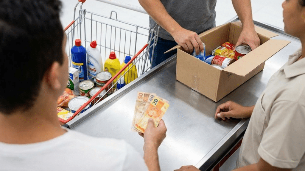Cliente no caixa pagando com dinheiro, colocando as compras em uma caixa de papelão trazida de casa