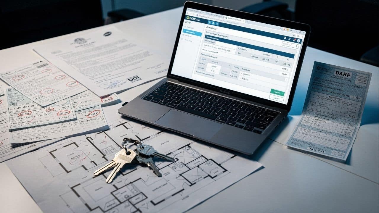 O ganho de capital representa a diferença positiva entre o valor de venda do imóvel e o seu custo de aquisição atualizado conforme as notas fiscais de reformas. Para reduzir a base de cálculo, o vendedor pode somar ao preço de compra os valores pagos em ITBI e escrituras registradas.