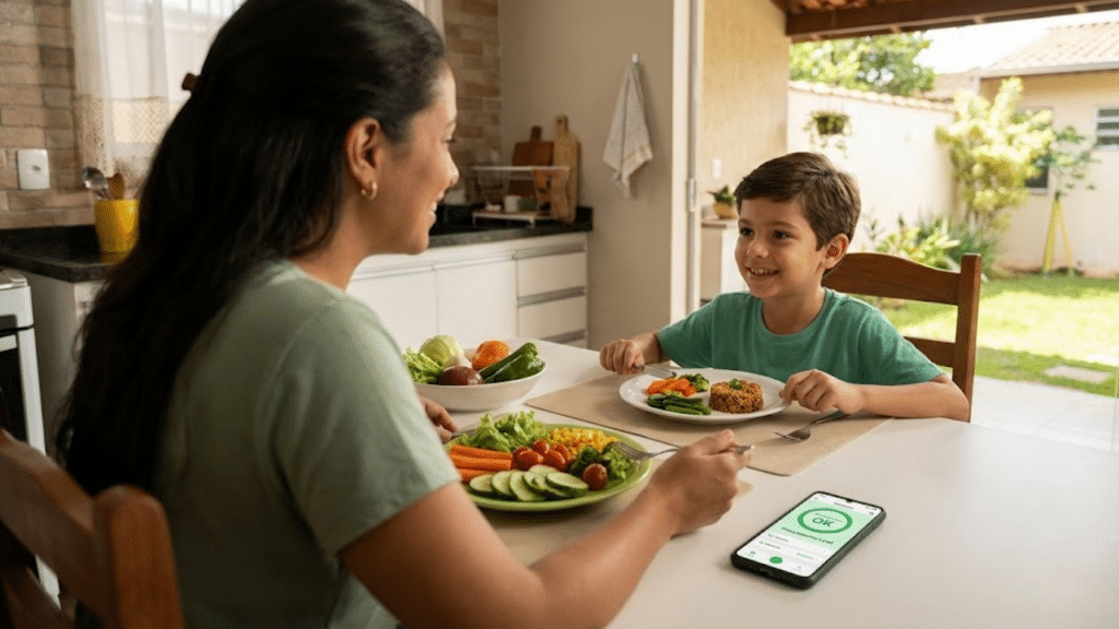 Criança com PKU desfruta de refeição equilibrada ao lado da mãe