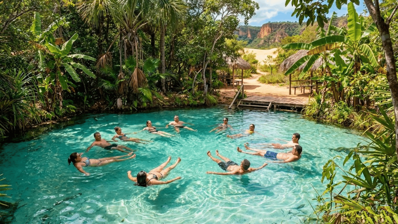 Os fervedouros são nascentes de rios subterrâneos onde a água brota da areia com pressão suficiente para manter qualquer pessoa na superfície. O fenômeno se chama ressurgência e cria piscinas naturais de tons que variam entre azul-turquesa e verde-esmeralda. O Jalapão concentra mais de uma dezena desses pontos, cada um com personalidade própria.