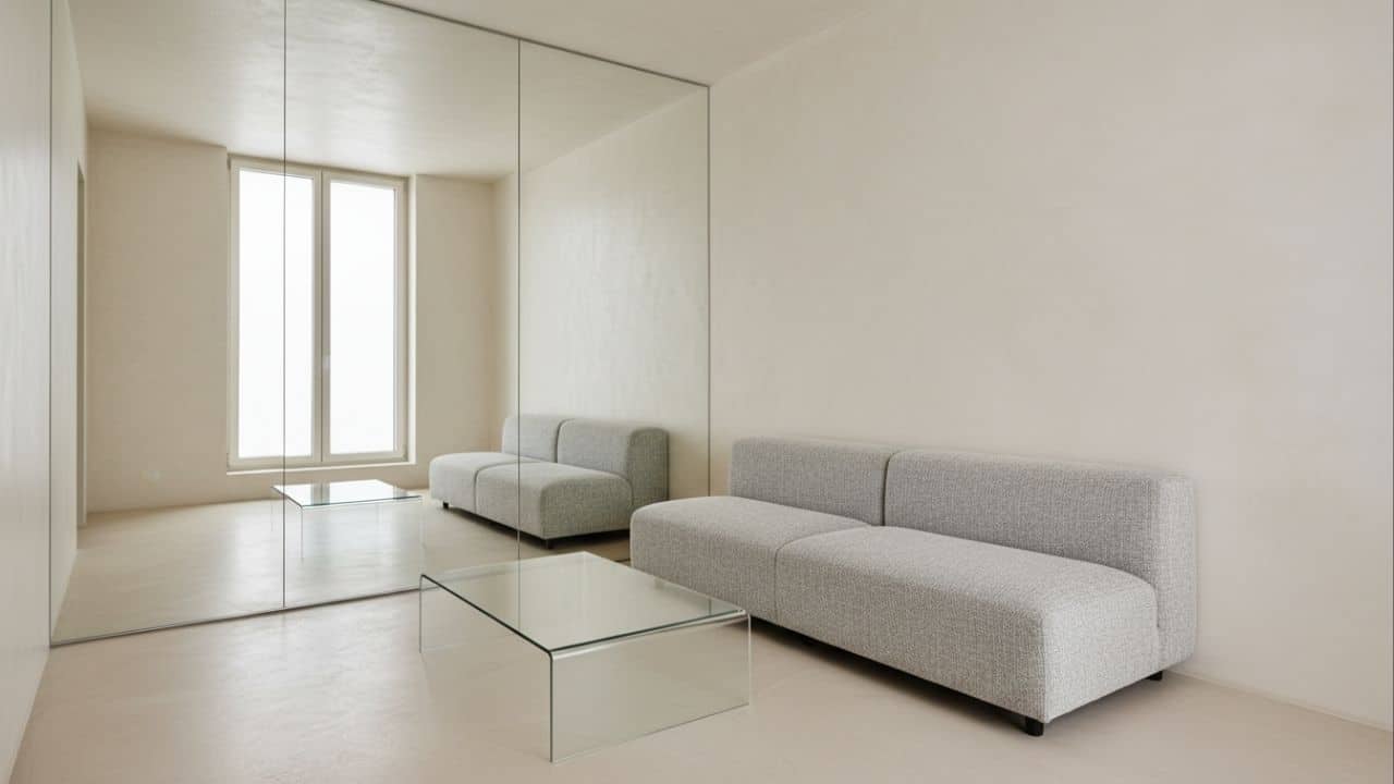 O uso de superfícies reflexivas e tonalidades neutras é a base para “enganar” o olhar e recuar os limites físicos de um cômodo. Ao posicionar espelhos grandes em paredes opostas a janelas, a luz natural é refletida, duplicando visualmente a área do ambiente. Na prática, um espelho de parede inteira na sala pode transformar a sensação de 15m² em um espaço aberto de 30m².