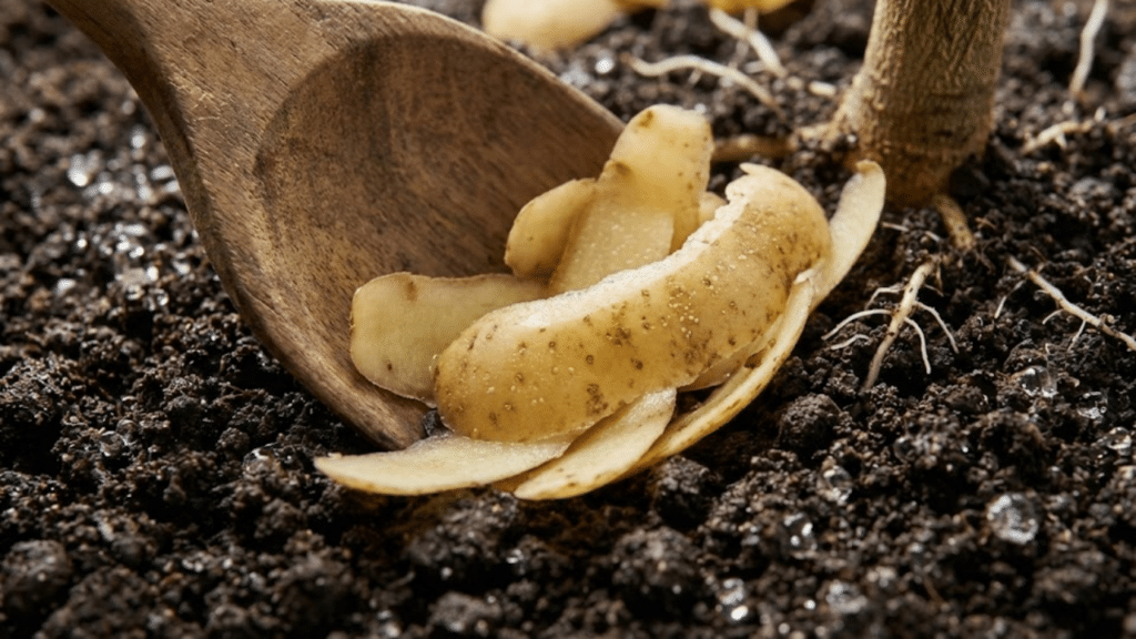 Close-up detalhado de cascas de batata sendo misturadas à terra úmida