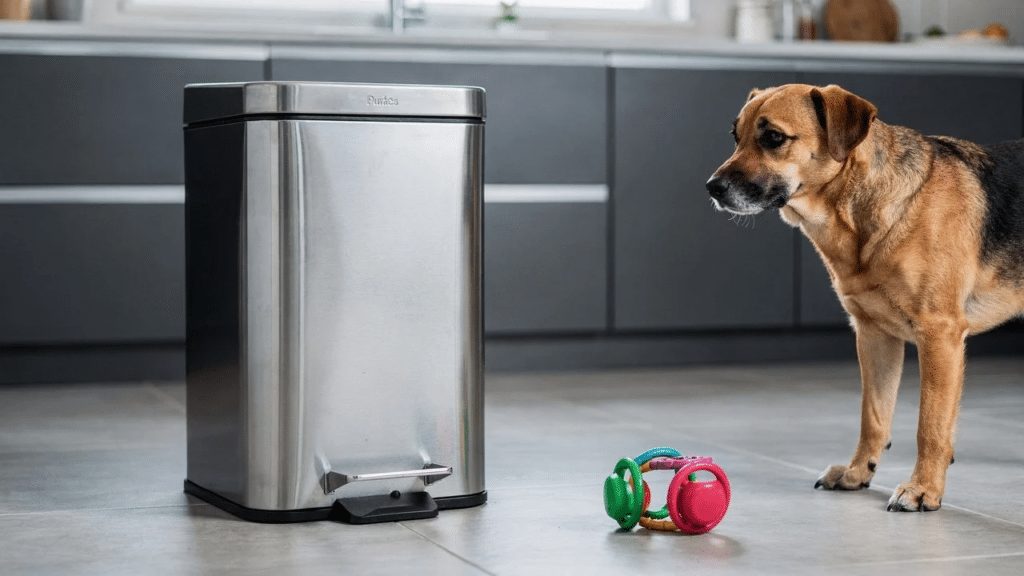 - Lixeiras com pedal ou tampa firme: modelos pesados ou com travas dificultam que o cão abra usando focinho ou patas.