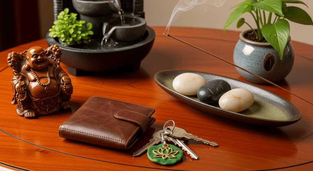 Qual é o significado simbólico da carteira e das chaves no Feng Shui?