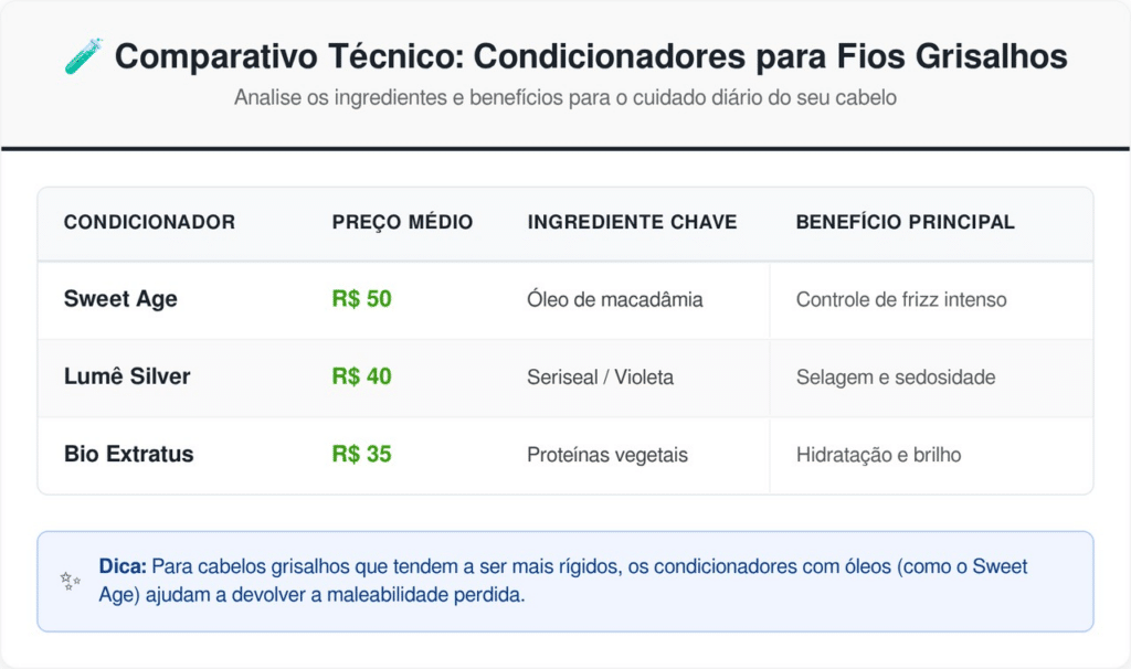 Os cabelos grisalhos perdem elasticidade e tornam-se naturalmente mais porosos, exigindo condicionadores com óleos e proteínas para selar as cutículas. Opções acessíveis de farmácia focam em hidratação profunda sem pesar, revitalizando os fios logo nas primeiras aplicações.